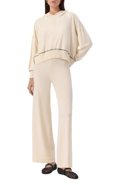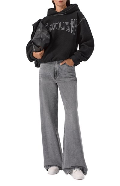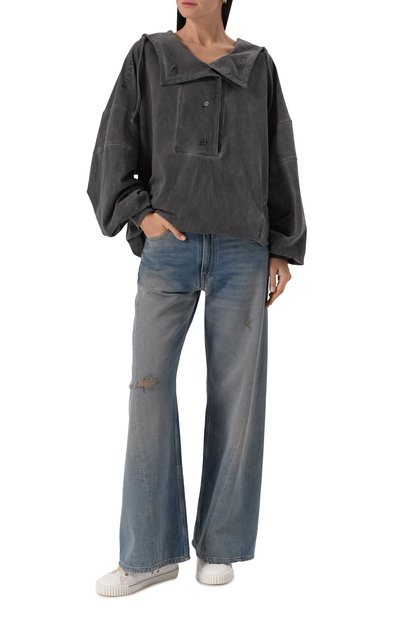 Декоративно состаренное джинсовое худи с выбеленными швами выполнили из хлопкового денима. Модель с глубоким капюшоном и спущенной линией плеч дополнили широкой шнуровкой и карманом «кенгуру».