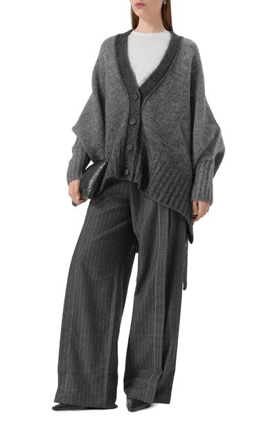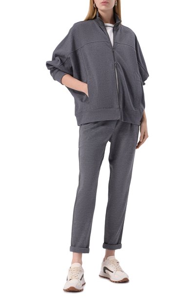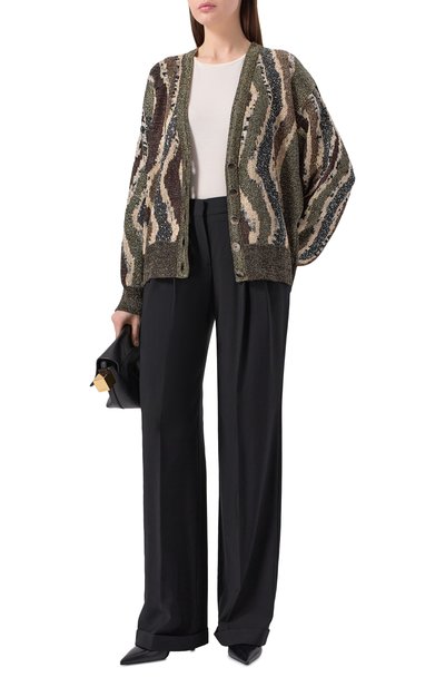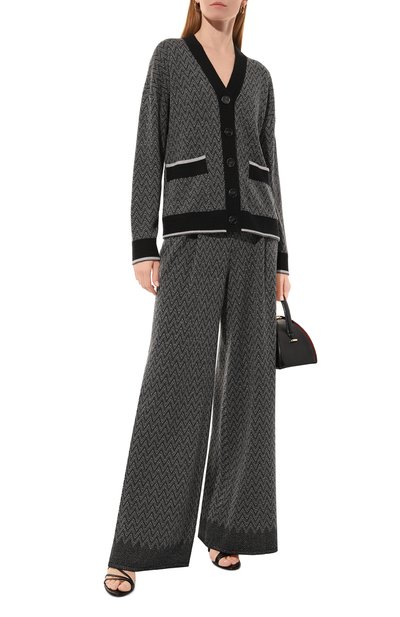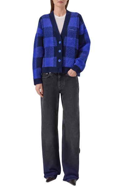 Кардиган с контрастными жаккардовыми узорами связали из шерсти первого пострига. Эластичную модель, застегивающуюся встречной молнией, украсили фирменными звездами сзади.
