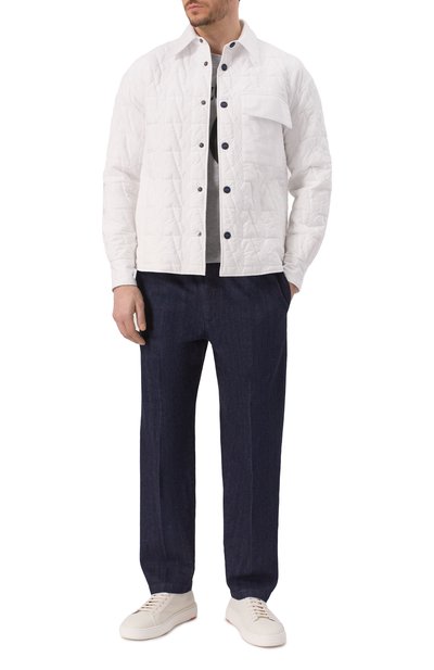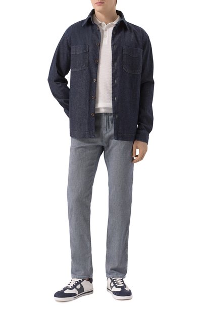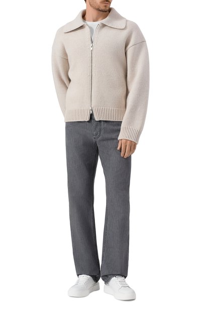 Джинсы со стрелками, четырьмя врезными карманами и отворотами декоративно состарили при помощи потертостей и пятен. Модель из хлопкового денима украсили металлическими звездами сзади.