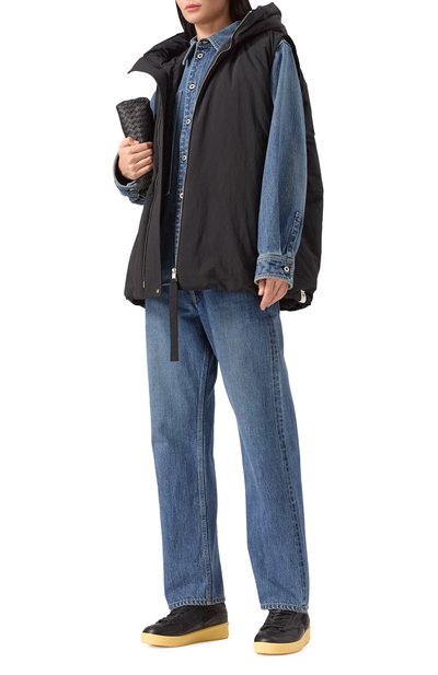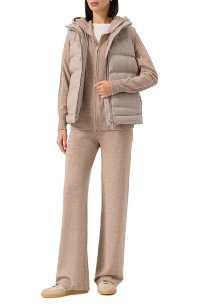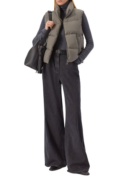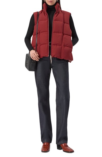 Утепленный жилет с воротником-стойкой и кулиской внизу сшили из плотного стрейчевого трикотажа на основе вискозы. Модель на встречной молнии украшена фирменной брендированной пластиной.