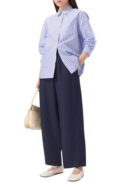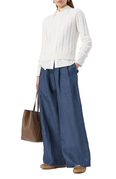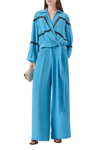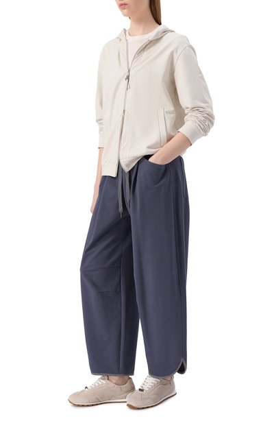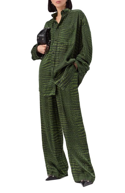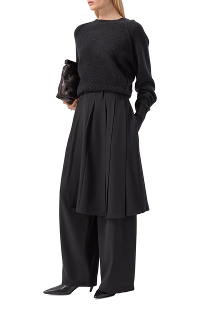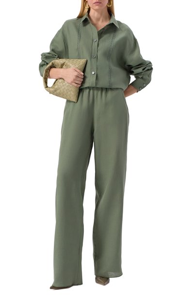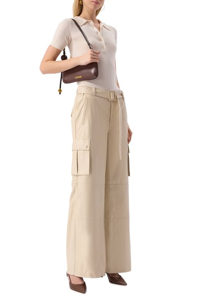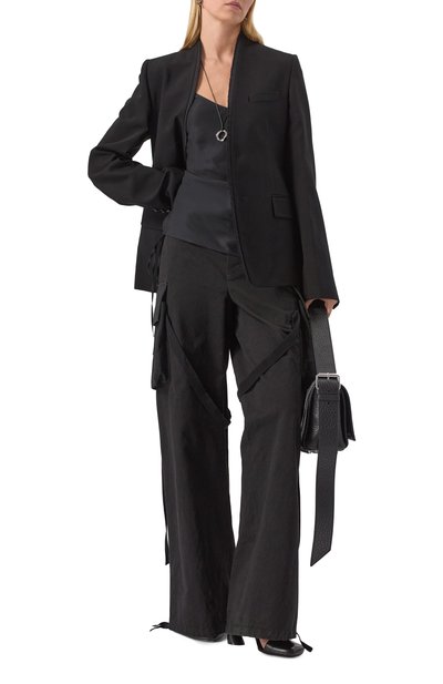 Брюки с двойным поясом, создающим эффект многослойности, сшили из хлопкового вощеного фая. Модель с декоративными лентами дополнена шестью карманами: врезными боковыми, задними на молниях и крупными карго с клапанами.