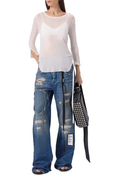 Джинсы с двойным поясом состарили с помощью декоративных потертостей. Модель из хлопкового денима дополнили пятью карманами, подчеркнув правый задний фирменной двухслойной пластиной.