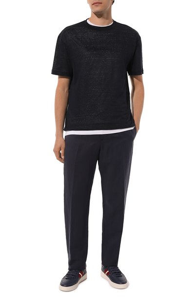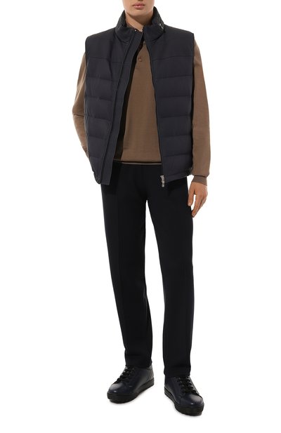 Для пошива брюк с поясом-кулиской использовали хлопковый трикотаж с добавлением кашемира. Эластичную модель со средней посадкой дополнили двумя парами накладных карманов.
