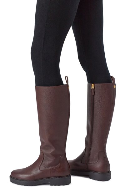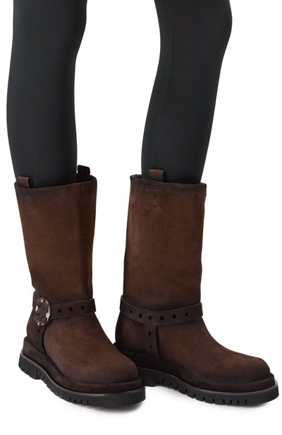 Полусапоги с внутренней отделкой из овчины и кожи выполнили из патинированной замши. Сбоку модель украсили стежком фирменного оранжевого оттенка Arancio Santoni, в тон которому – подметка на широкой брендированной подошве с протектором.