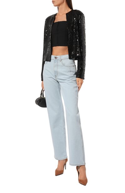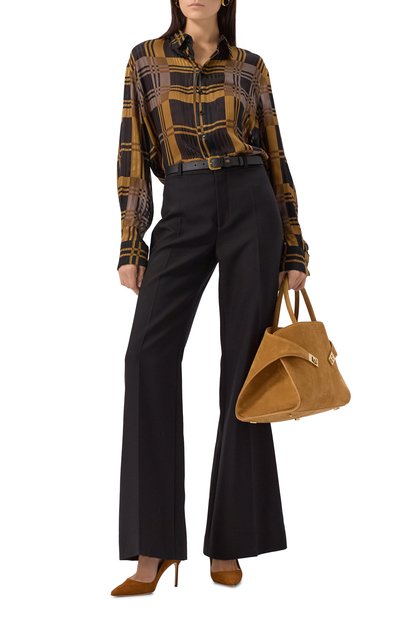 Туфли с зауженным мысом и устойчивым высоким каблуком сшили из замши. Модель с глубоким вырезом и кожаным подкладом украсили золотистой эмблемой марки сбоку.