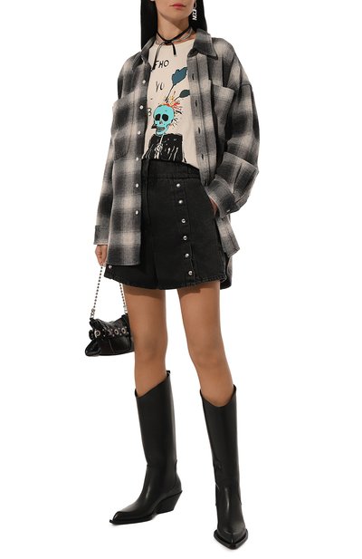 Сапоги на невысоком квадратном каблуке выполнили из гладкой кожи. Голенище модели сверху дополнили ремешком с накладкой в виде фирменной эмблемы.