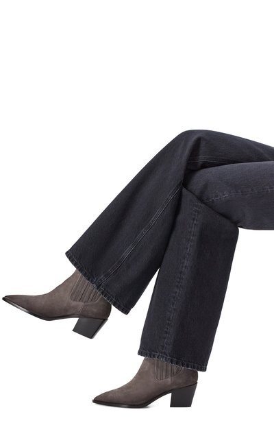 Ботильоны с зауженным мысом выполнили из тонкой замши. Пару на невысоком каблуке дополнили боковыми вставками из эластичного текстиля и петлей с золотистой эмблемой.