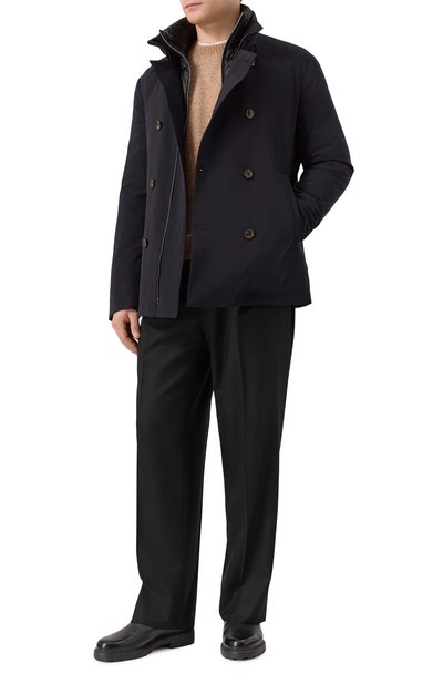 Двубортную стеганую куртку Grey на утином пуху выполнили из обработанной по технологии Storm System® мембранной шерстяной ткани с добавлением кашемира, произведенной на мануфактуре Loro Piana. Модель с боковыми и внутренними карманами на молниях декорировали логотипом под воротником-стойкой сзади и эмблемой на рукаве. В комплекте – отстегивающаяся манишка с высоким воротником.