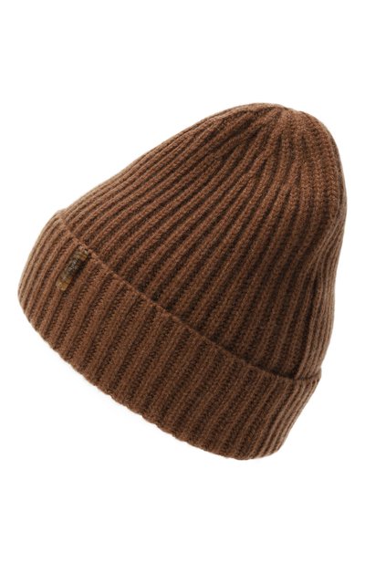 Для изготовления шапки бини использовали гладкий трикотаж из кашемира и шелка. Широкий отворот аксессуара украсили жаккардовыми полосками и логотипом.