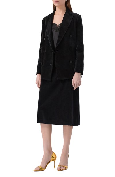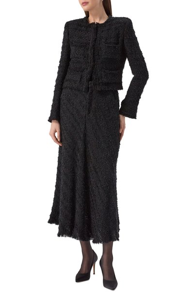 Мини-юбку с высокой посадкой и потайной молнией сзади выполнили из твида с металлизированным волокном. Наши стилисты предлагают создать образ total black с парным жакетом.