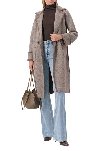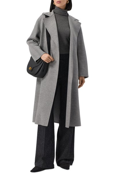 Пальто Carola с фигурной кокеткой, высокой шлицей и двумя карманами сшили из фактурной полушерстяной ткани. Модель с поясом-лентой, патами на рукавах и атласным подкладом украсили миниатюрными пайетками.
