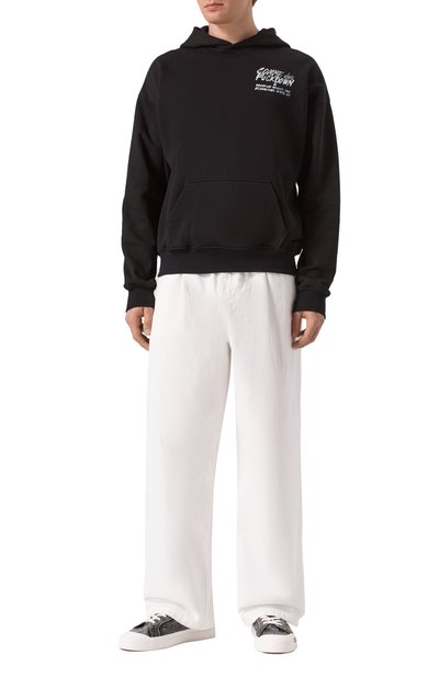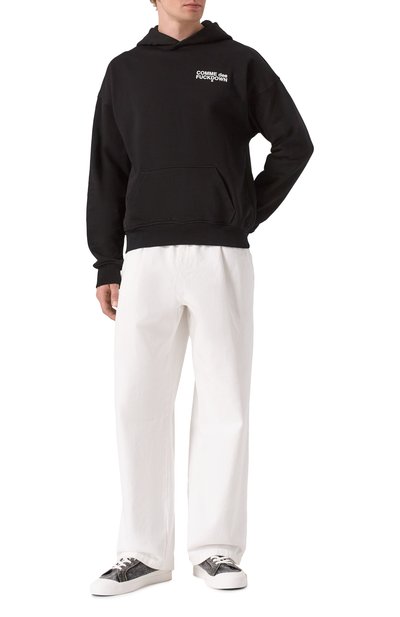 Для изготовления худи Cornely с манжетами и поясом в рубчик использовали трикотаж из чистого хлопка. Спереди модель с карманом «кенгуру» декорировали фактурным вышитым логотипом.