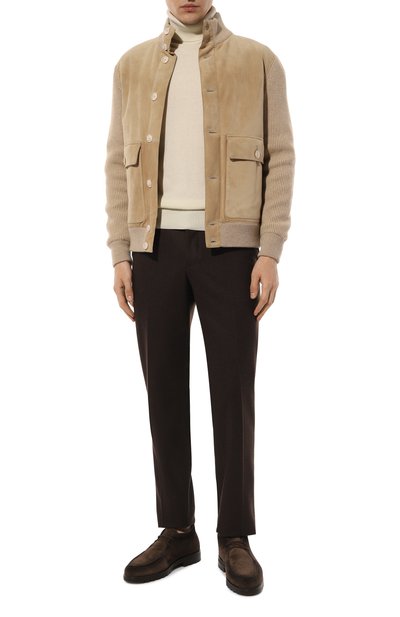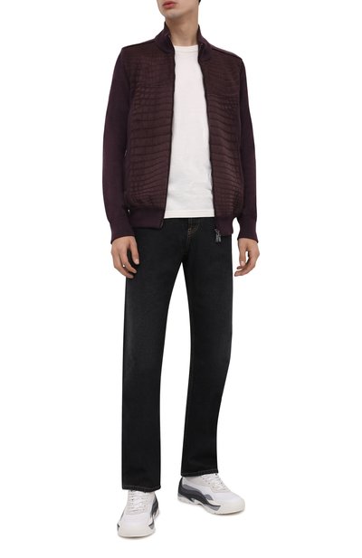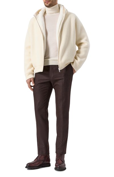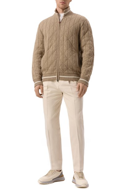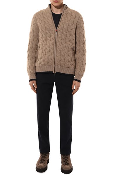 Кардиган с высокой горловиной и боковыми карманами связали рельефным узором из кашемира. Модель с контрастным стичингом на манжетах и поясе в рубчик застегивается встречной молнией с пуллерами фирменного алого оттенка.