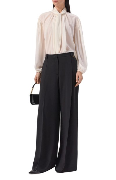 Свободные брюки с двумя карманами по бокам и еще парой сзади выполнили из костюмной шерсти. Под передними шлевками модели заложили защипы, которые переходят в отутюженные стрелки.