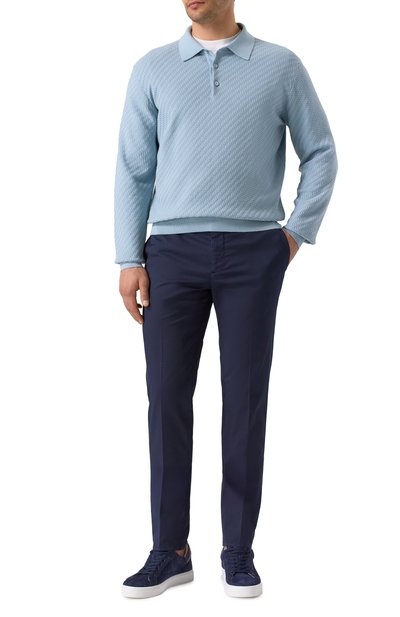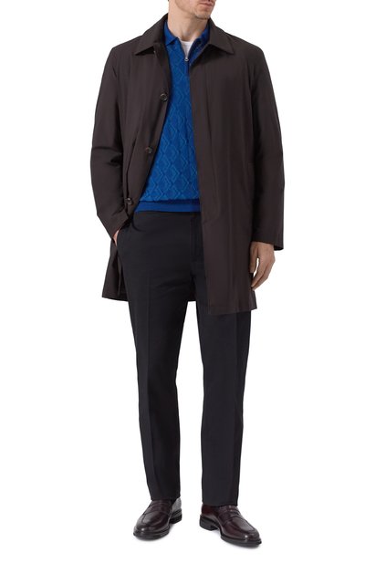 Поло с графичным жаккардовым узором спереди связали из кашемировой пряжи с добавлением шелка. Модель с рифлеными манжетами и поясом застегивается короткой молнией.