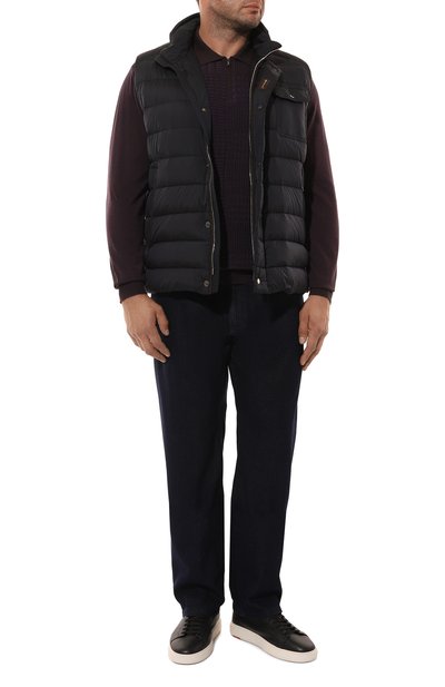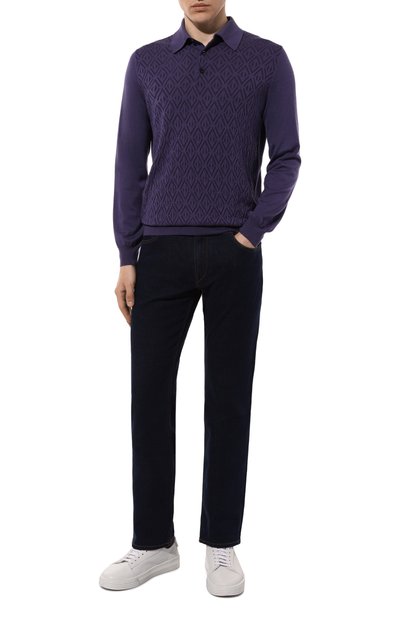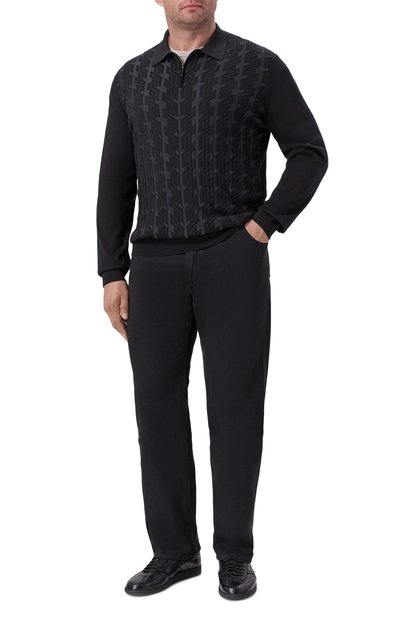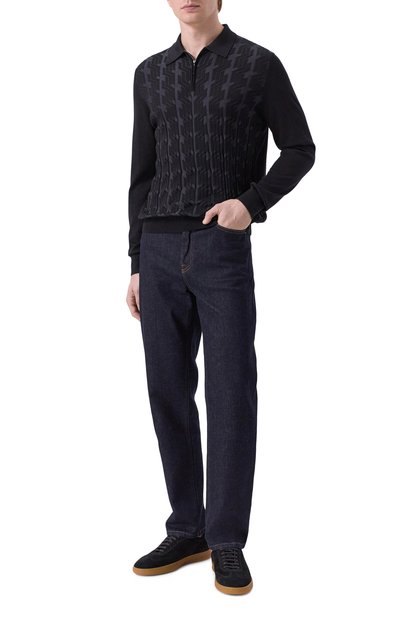 Поло кроя Regular fit сшили из шерстяного трикотажа с добавлением шелка. Модель c жаккардовым узором в виде фирменных октагонов спереди застегивается молнией с фигурным серебристым пуллером.