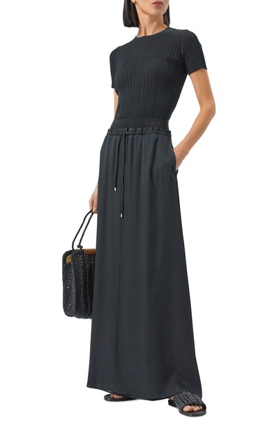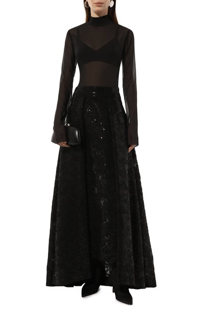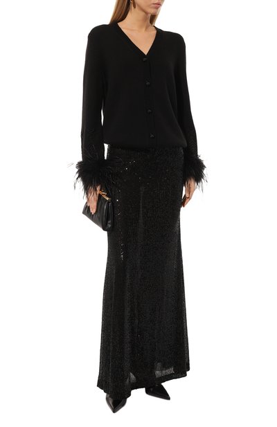 Макси-юбку из полиэстера расшили круглыми пайетками со всех сторон. Модель, застегивающуюся потайной молнией сзади, дополнили широким бархатным поясом с бантом.