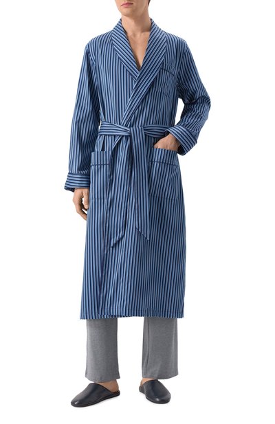 Халат Vestaglia с шалевым воротником выполнили из гладкой хлопковой ткани с принтом в полоску. Модель с нагрудным и боковыми накладными карманами дополнили поясом.