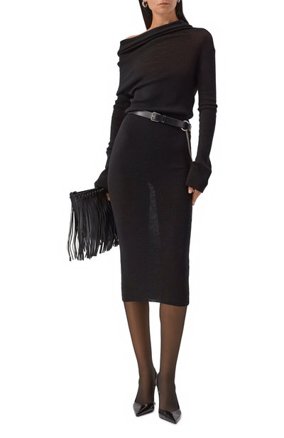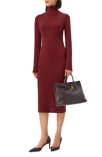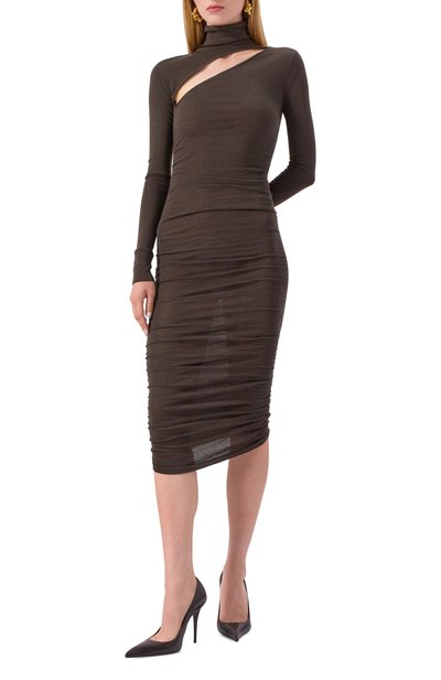 Приталенное миди-платье с высоким воротником, манжетами и нижней кромкой в рубчик выполнили из шерстяного трикотажа с добавлением полиамида. Сзади модель украсили рельефными швами и патчами с фирменным числовым кодом.