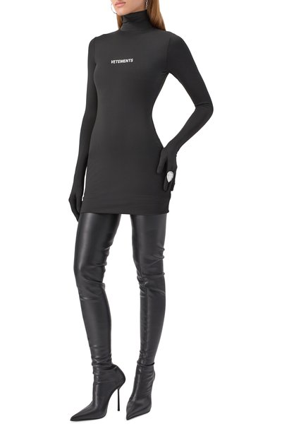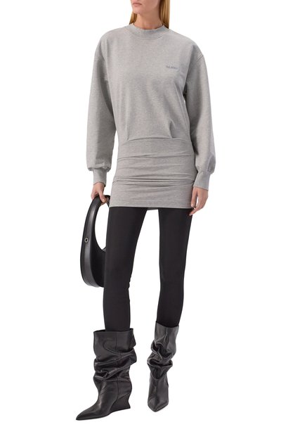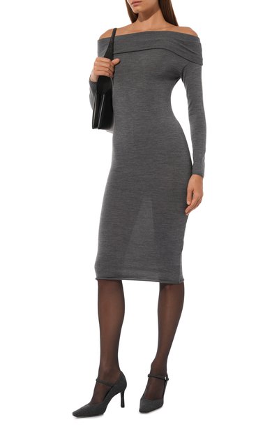 Платье с акцентным горизонтальным швом на груди выполнили из меланжевого трикотажа на основе шерсти первого пострига и полиэстера. Спинку модели с высоким воротом украсили фирменной строчкой.