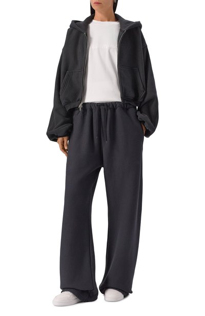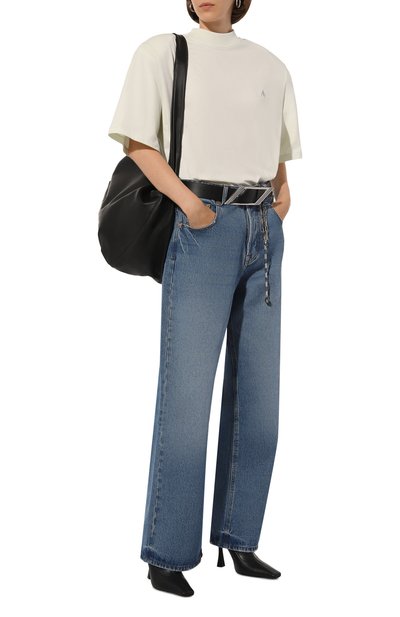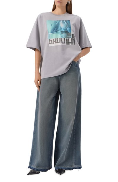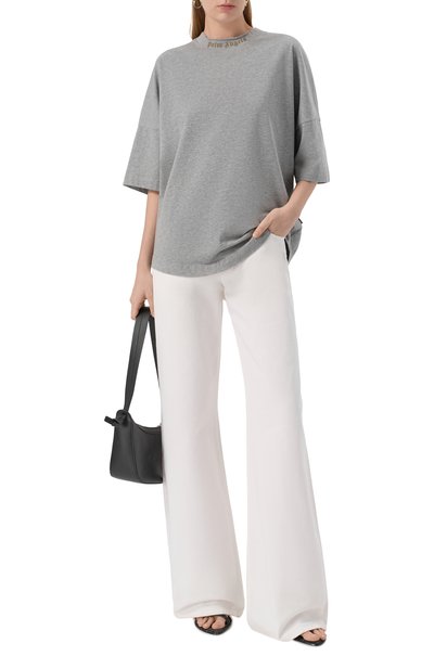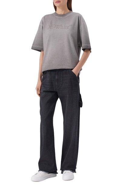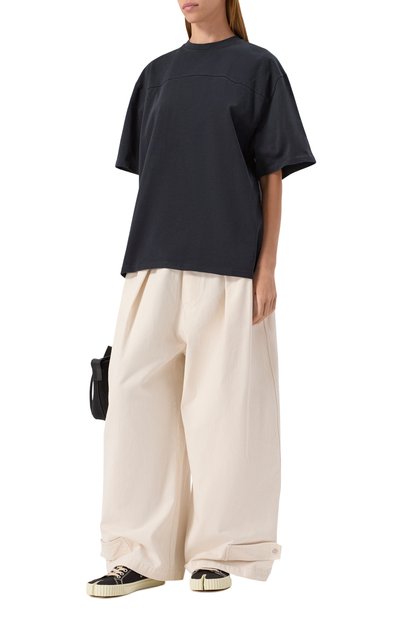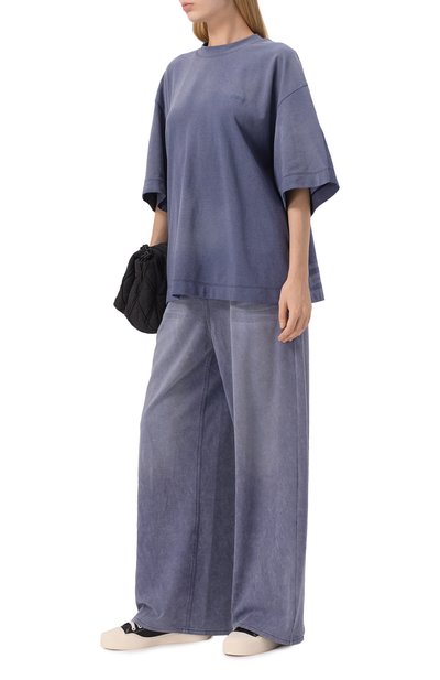 Oversize-футболку с увеличенным кантом вдоль круглой горловины выполнили из меланжевого хлопкового трикотажа. Спереди модель украсили нашивкой со знаковым числовым кодом, словно приклеенным скотчем, а сзади – фирменной белой строчкой.