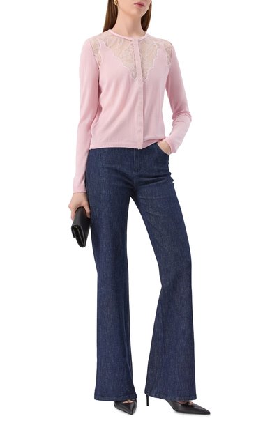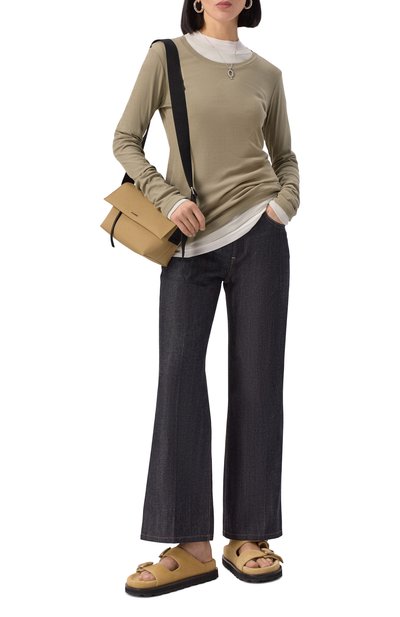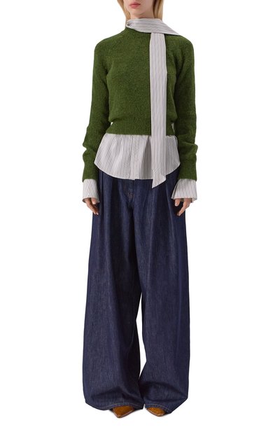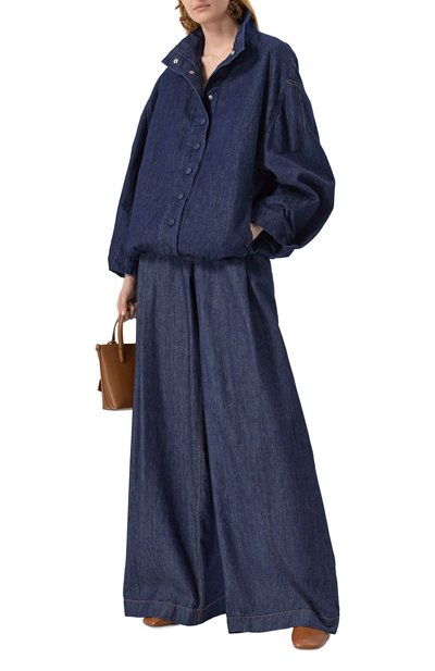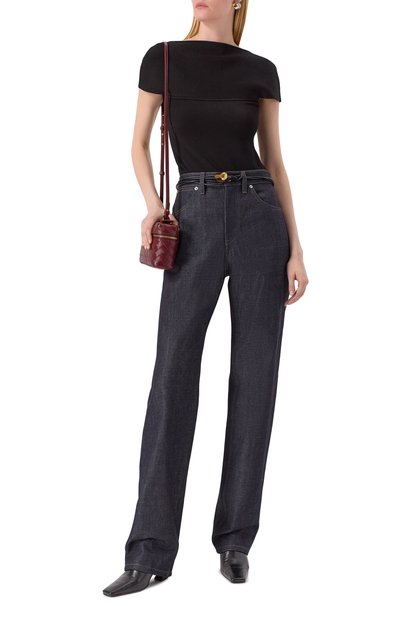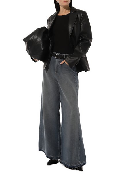 Широкие расклешенные джинсы с пятью карманами выполнили из хлопкового денима. Сзади модель с необработанными швами и низом украсили знаковой строчкой и патчем с фирменным числовым кодом.