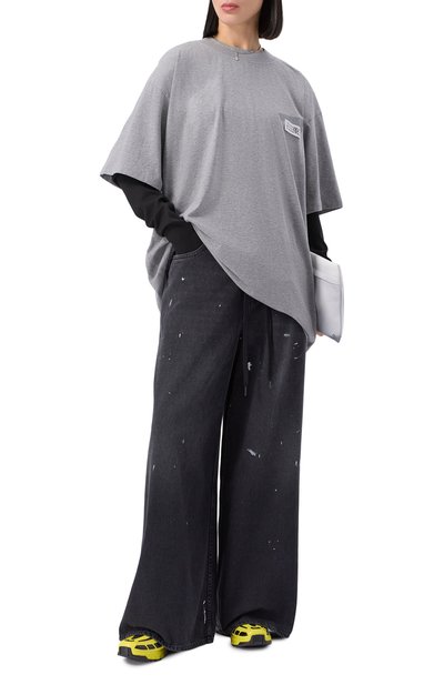 Расклешенные джинсы с пятью карманами, задние из которых сделали асимметричными, выполнили из хлопкового денима. Пояс модели украсили четырьмя фирменными стежками.