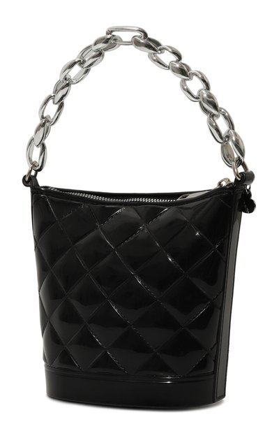 Сумку с цельнокроеной объемной ручкой выполнили из экокожи. Аксессуар с внутренним карманом на молнии украсили металлическим логотипом и зеркальными заклепками по всей поверхности.