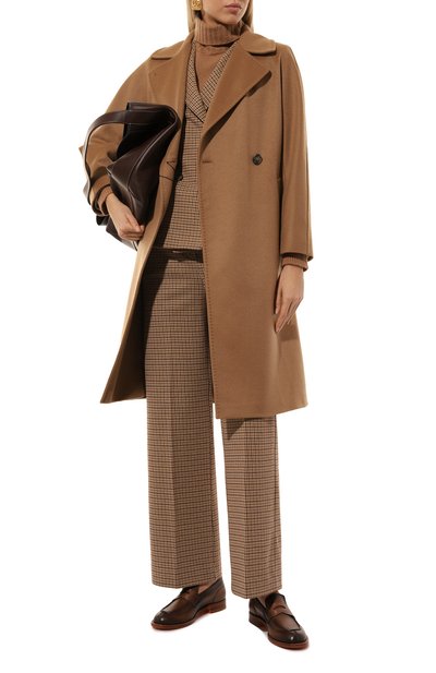 Двубортное пальто Resina с широкими лацканами и высокой шлицей сзади дополнили боковыми карманами и съемным поясом-лентой. Края модели из драпа на основе шерсти первого пострига подчеркнули стежками пунто.