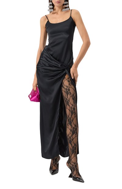 Облегающее драпированное мини-платье без подклада сшили из стрейчевого металлизированного материала на основе вискозы. Модель с регулируемыми бретелями, украшенными кристаллами, застегивается молнией сбоку.