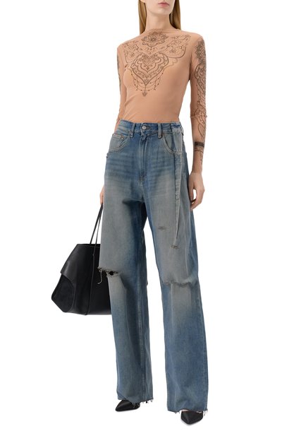 Oversize-джинсы Ksuper Dune с защипами на брючинах и пятью карманами выполнили из неэластичного денима. Выбеленную модель с потертостями и масляными пятнами декорировали сзади фирменными текстильной биркой и вышитыми крестами 3х4, а на поясе с отворотом – тиснеными логотипами.