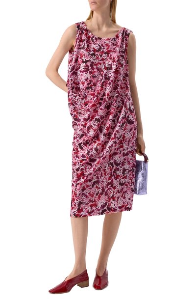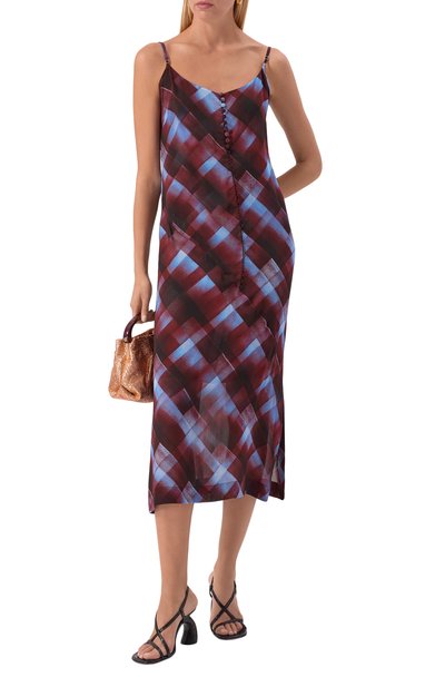 Приталенное мини-платье с мягкой драпировкой на талии изготовили из стрейчевого материала, плотно расшитого цилиндрическими пайетками. Одну из асимметричных бретелей выполнили из цепочки с крупными кристаллами и дополнили карабином для регулировки длины.