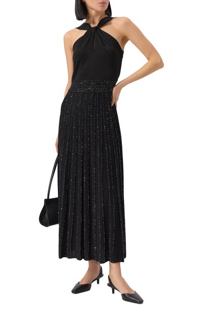 Приталенное мини-платье с мягкой драпировкой на талии изготовили из стрейчевого материала, плотно расш итого цилиндрическими пайетками. Одну из асимметричных бретелей выполнили из цепочки с крупными кристаллами и дополнили карабином для регулировки длины.