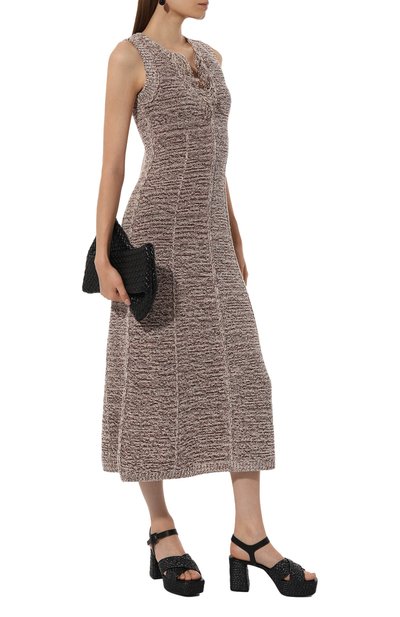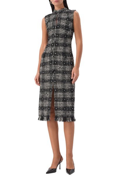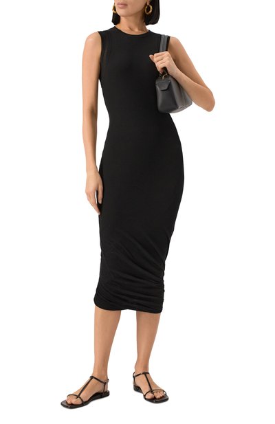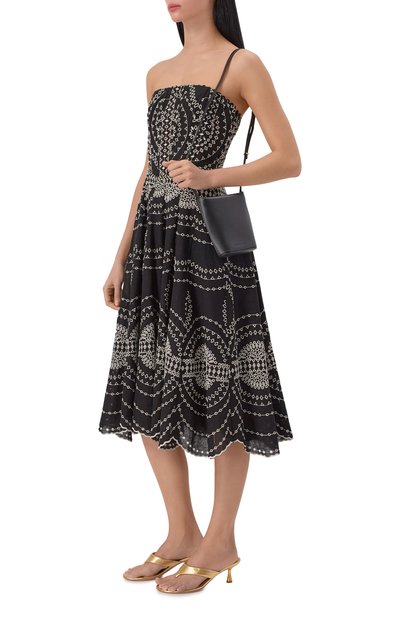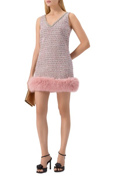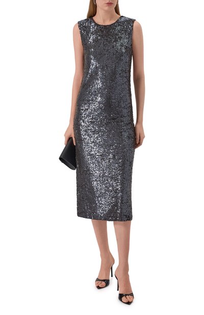 Приталенное мини-платье с мягкой драпировкой на талии изготовили из стрейчевого материала, плотно расшитого цилиндрическими пайетками. Одну из асимметричных бретелей выполнили из цепочки с крупными кристаллами и дополнили карабином для регулировки длины.