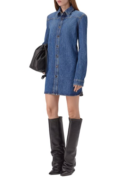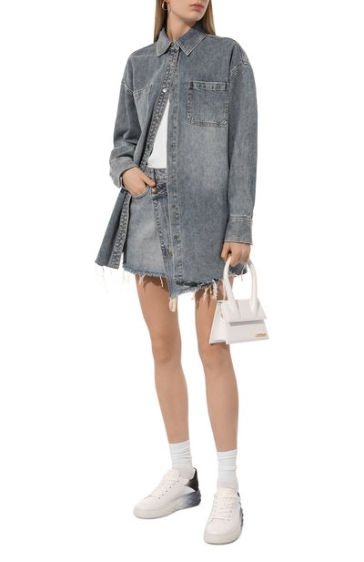 Oversize-рубашку Dune с закругленным низом и прямоугольными манжетами выполнили из жесткого хлопкового денима. Выбеленную модель с потертостями и декоративными масляными пятнами украсили фирменной вышитой эмблемой T-box и логотипом над нагрудным карманом.