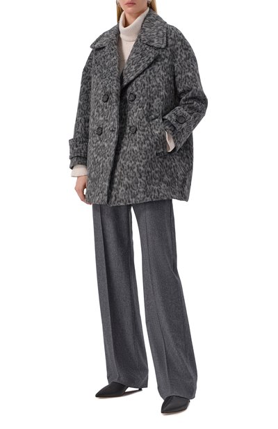 Двубортное пальто Arianna с заостренными лацканами и высокой шлицей дополнили тремя карманами. Для изготовления модели использовали эластичную ткань на основе шерсти, акрила и полиэстера.