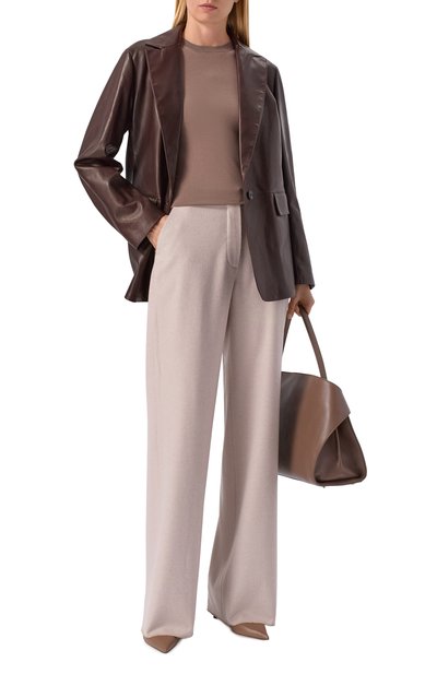 Пуловер с рукавом 2/3 выполнили из мериносовой шерсти диаметром 13,5 микрон. Манжеты, пояс и кант круглой горловины связали эластичным узором в рубчик.