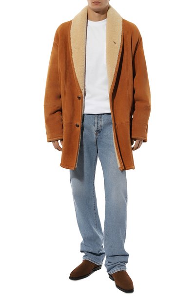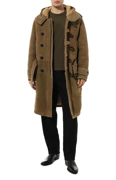 Дубленку с манжетами и поясом из трикотажа в рубчик сшили из овчины. Модель с глубоким капюшоном и тремя накладными карманами застегивается встречной молнией.