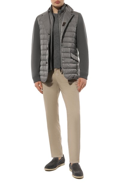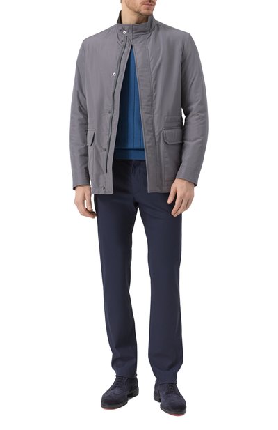 Куртку с четырьмя накладными карманами и двумя шлицами дополнили вшитым поясом сзади. Модель из фланели на основе шерсти и кашемира застегивается роговыми пуговицами.