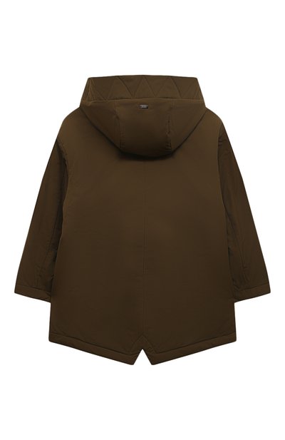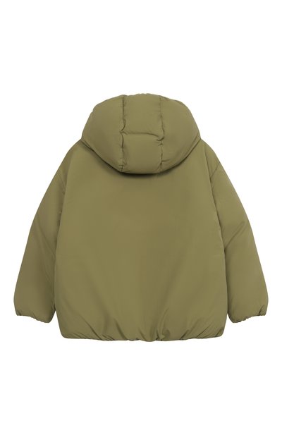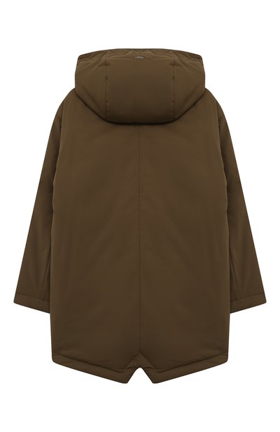 Стеганую парку из переработанного нейлона утеплили утиным пухом. Капюшон дополнили съемной опушкой из меха енота. Куртка с внутренним и четырьмя внешними карманами застегивается встречной молнией, скрытой кнопочной планкой.