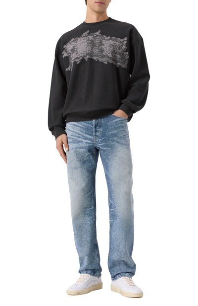 Свитшот свободного кроя, словно немного выцветший со временем, выполнили из хлопкового трикотажа. Спереди модель с отделкой в рубч ик декорировали логотипом, напоминающим граффити с потеками.