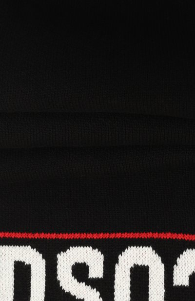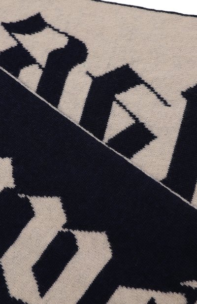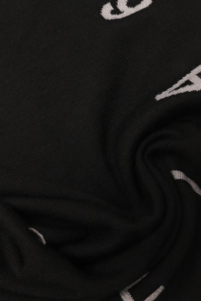 Шарф с жаккардовым логотипом в готическом стиле связали из микса хлопка и шерсти. Длины аксессуара хватит для пары оборотов вокруг шеи.