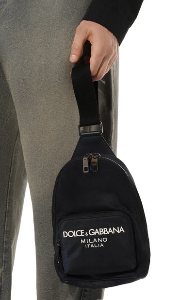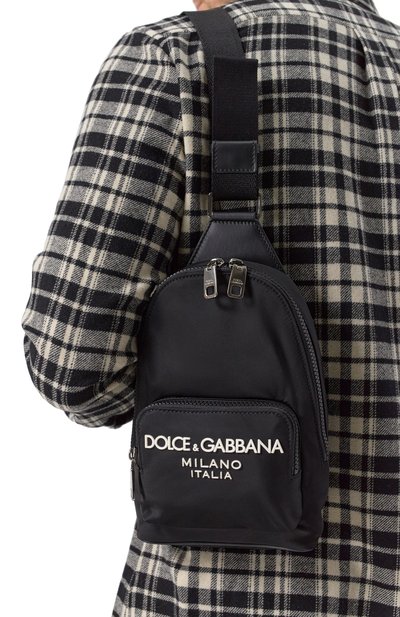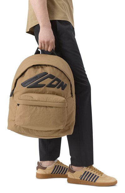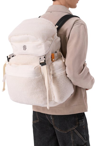 Рюкзак со спинкой из перфорированной микрофибры выполнили из трикотажа. Аксессуар с короткой ручкой и мягкими регулируемыми лямками украсили контрастным логотипом, расположенным над внешним карманом.