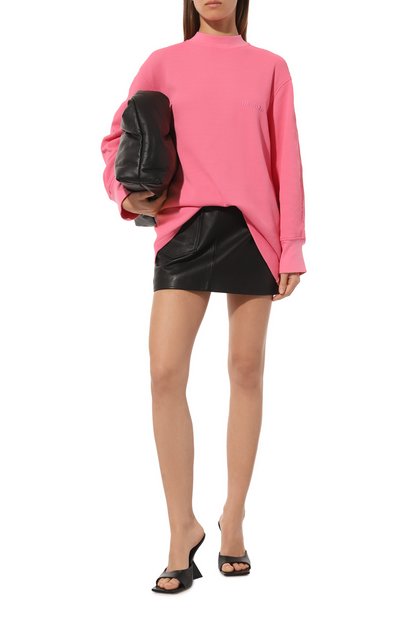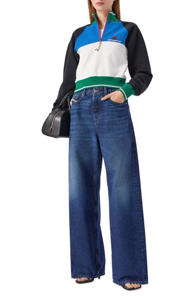 Разноцветный свитшот с рукавами реглан выполнили из полиэстерового трикотажа. Модель с высоким воротом, эластичным низом и двумя карманами застегивается укороченной молнией. Спереди – вышитый логотип марки.