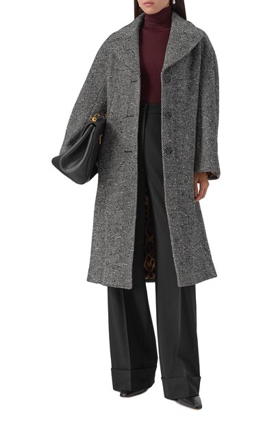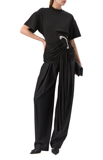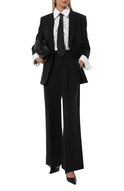 Брюки с двойными защипами и стрелками дополнили боковыми и задними прорезными карманами на пуговицах. Модель сшили из костюмной шерсти.