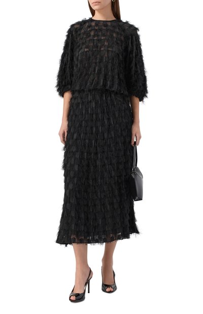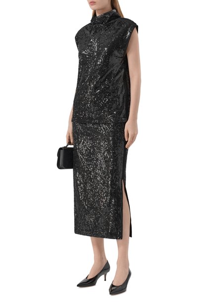 Юбку-карандаш Ecursi украсили фактурным геометричным узором. Для пошива модели с поясом-резинкой использовали трикотаж из полиэстера, а для подклада выбрали вискозу.