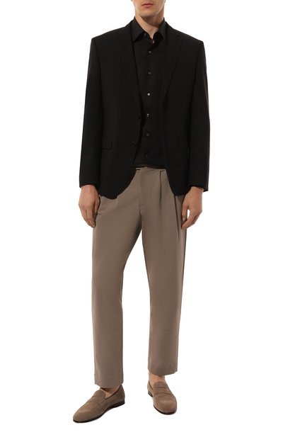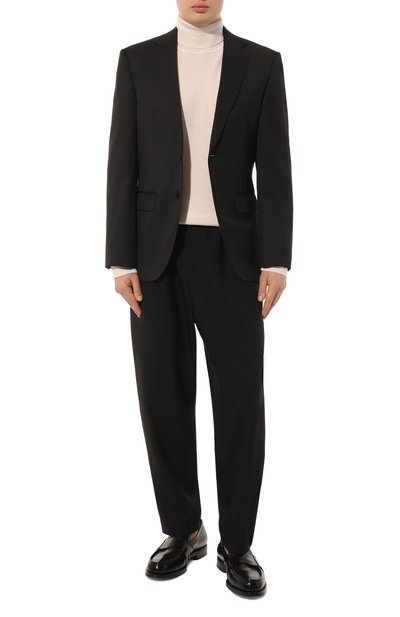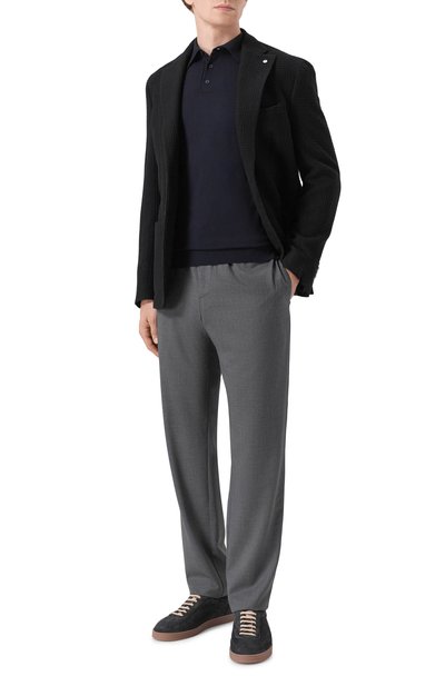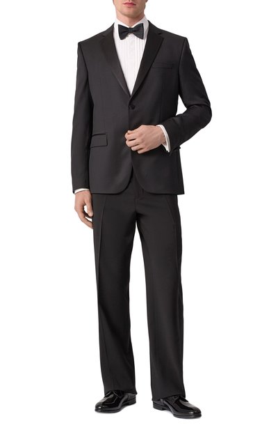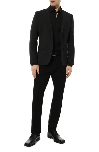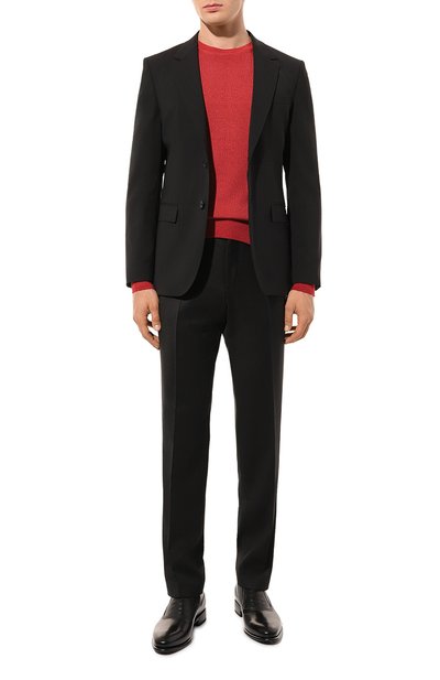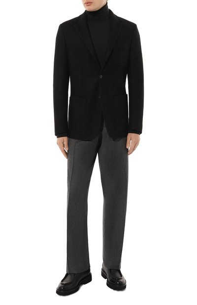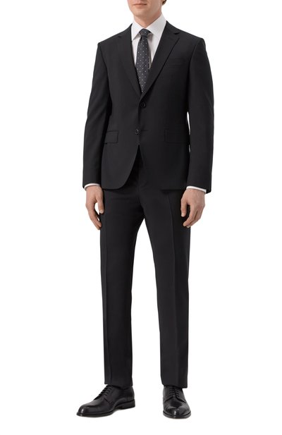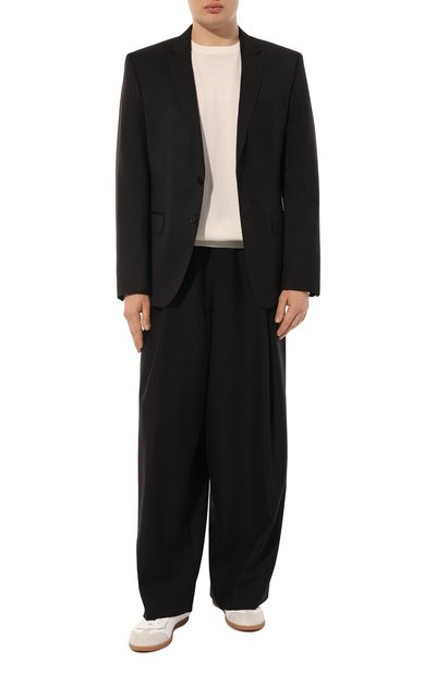 Пиджак с прямоугольными лацканами и парой шлиц дополнили тремя карманами. Модель на двух пуговицах изготовили из фактурной ткани на основе шерсти и полиамида.