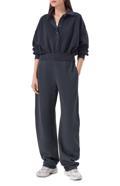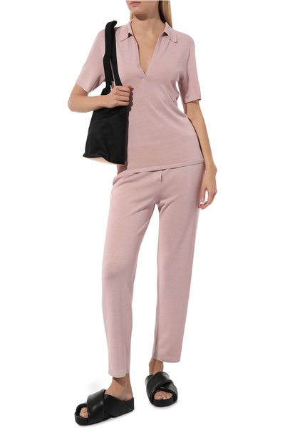 Брюки с высокой посадкой и широким поясом сшили из шерсти с добавлением лиоцелла и полиамида. Модель с патами на манжетах дополнили открытыми боковыми карманами и задним с клапаном.