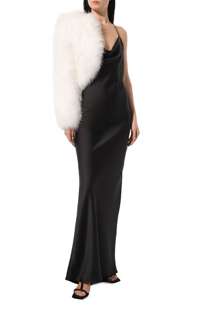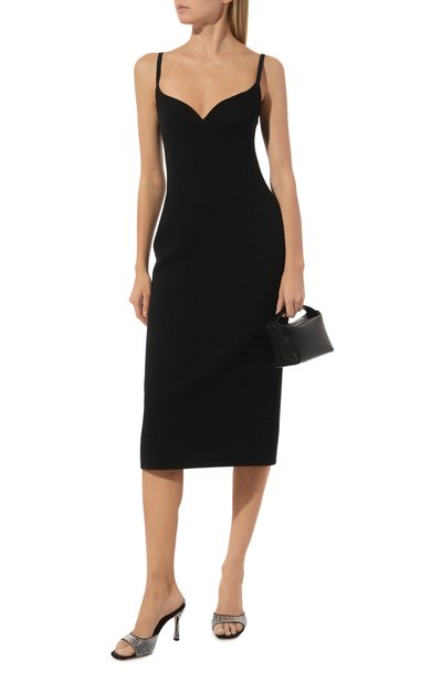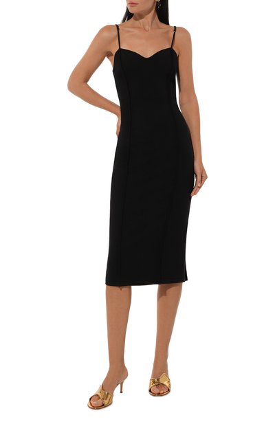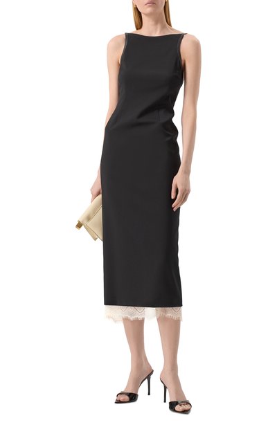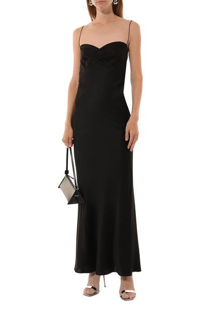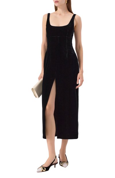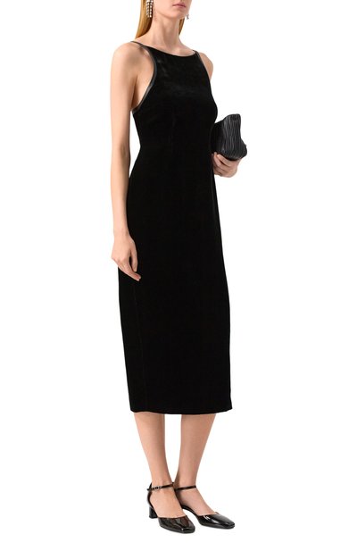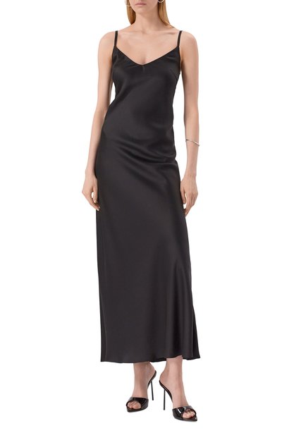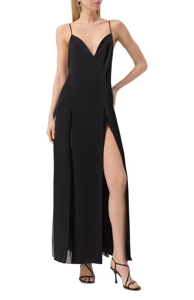 Платье с американской проймой и вырезом «хомут» напоминает комплект из свободного топа и облегающей макси-юбки. Иллюзию поддерживает сочетание разного по фактуре трикотажа на основе вискозы и шелка.