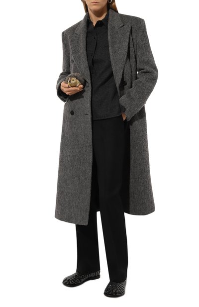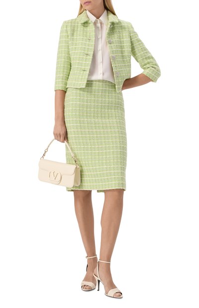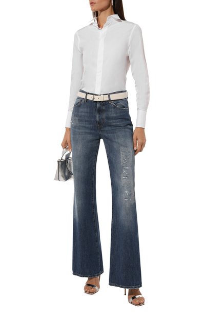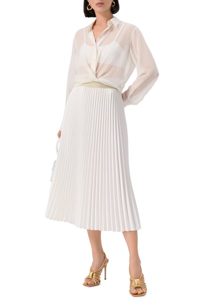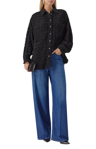 Рубашку с фигурным низом и закругленными манжетами выполнили из эластичного вискозного трикотажа. Приталенная модель застегивается перламутровыми пуговицами.